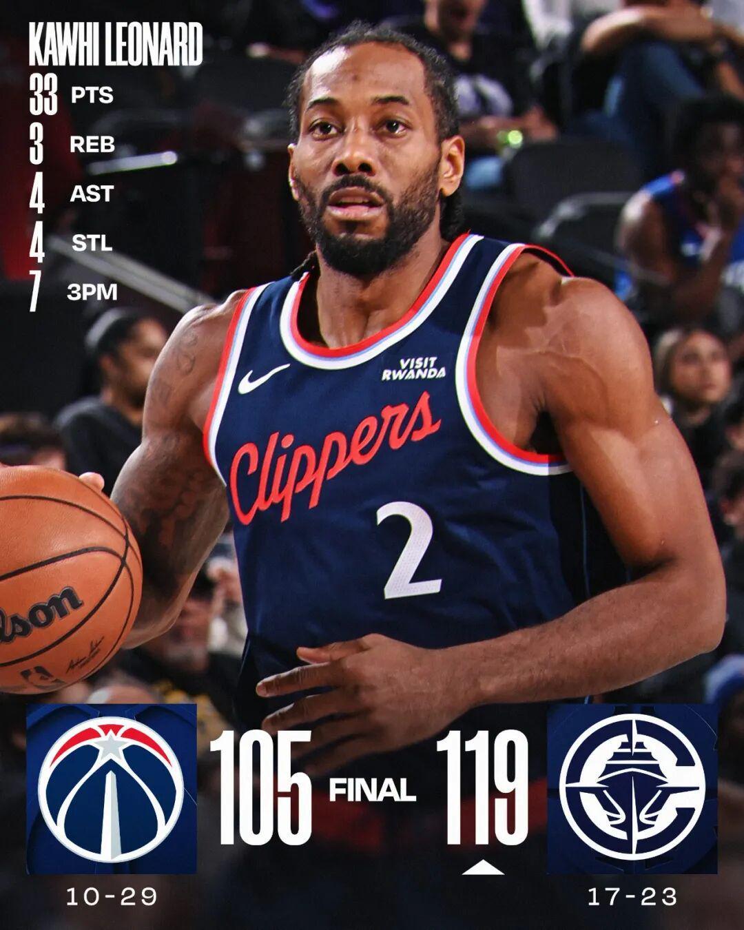 常规赛,快船主场119-105战胜奇才,取得四连胜。