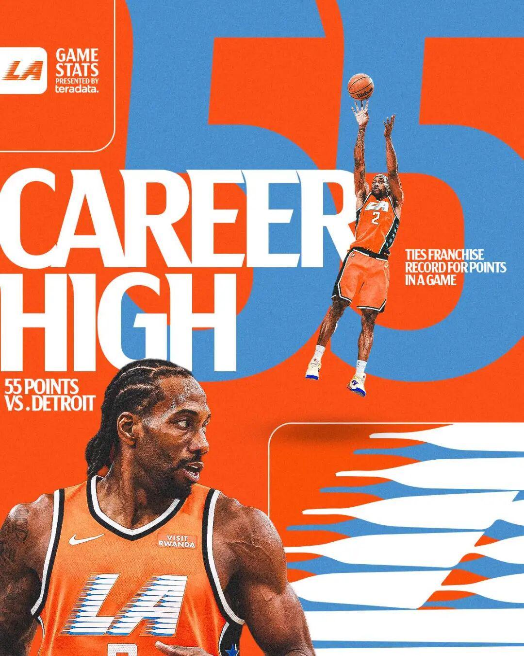要知道,在这波高光之前,伦纳德生涯一共也就拿过8场40+,而过去不到一个月,他不仅拿了3次40+,还把自己的生涯最高分从45分提高到了55分。