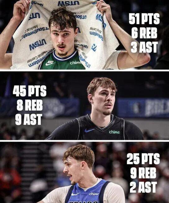 打雄鹿,19分10篮板3助攻。除了对雄鹿那场“仅得”19分,其他三场全是巨星级别的表演。51分那场,30投19中,三分9中6;45分那场,27投14中,三分4中2。这不是刷数据,是真的防不住。